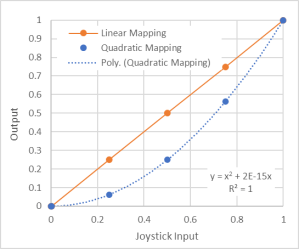 The robot Arduino also maps the user input quadratically to make it easier to command slow, controlled motion. In the figure below, the quadric mapping shows that less output is commanded at low command inputs: