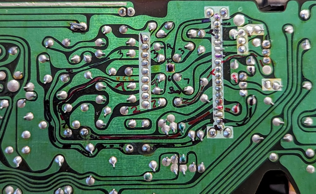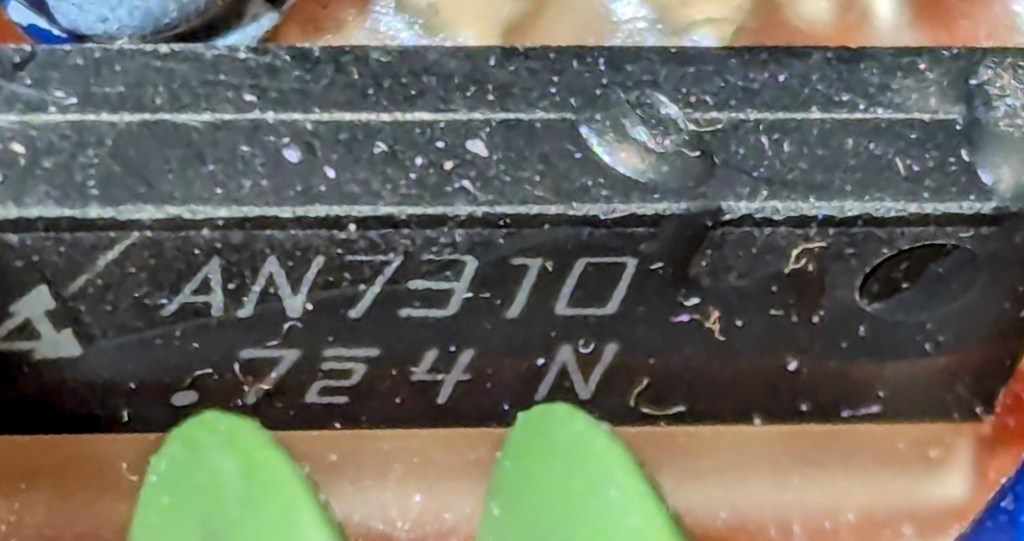 Initially, it wasn’t clear which chip was the cassette tape amplifier, but after searching visible part numbers it became clear that a Panasonic AN7310 was used. The datasheet can still be found online, which shows the pin out for the left and right audio as pins 1 & 9. These two pins were traced along the front and back of the PCB, and a convenient location to solder the lead wires was determined. The 3.5mm audio jack cable was soldered on to the front side of the PCB where the cassette tape input used to be routed.