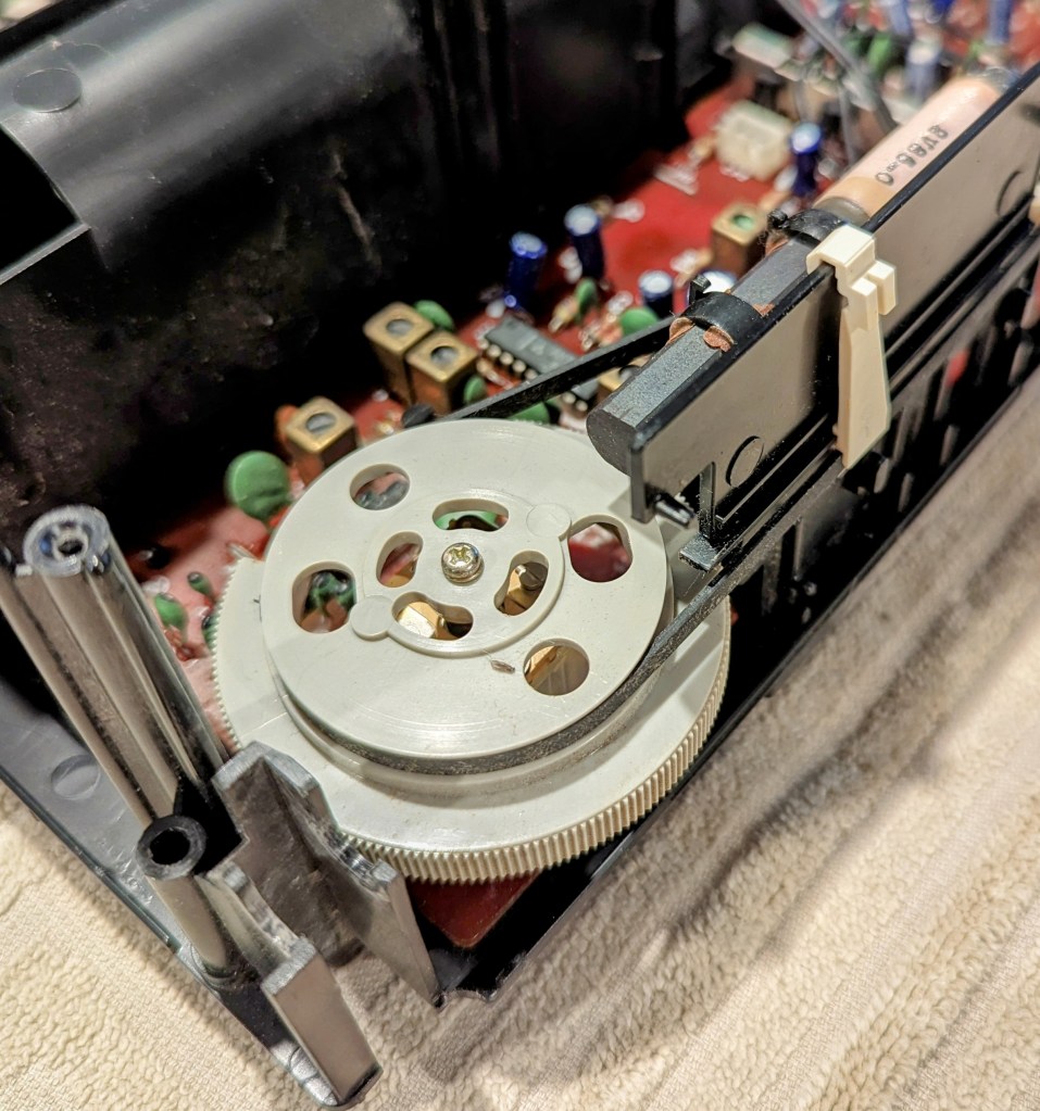 An interesting observation during disassembly was the design of the radio frequency selection. A knob rotates a potentiometer underneath, but also belt drives an indicator at the same time.