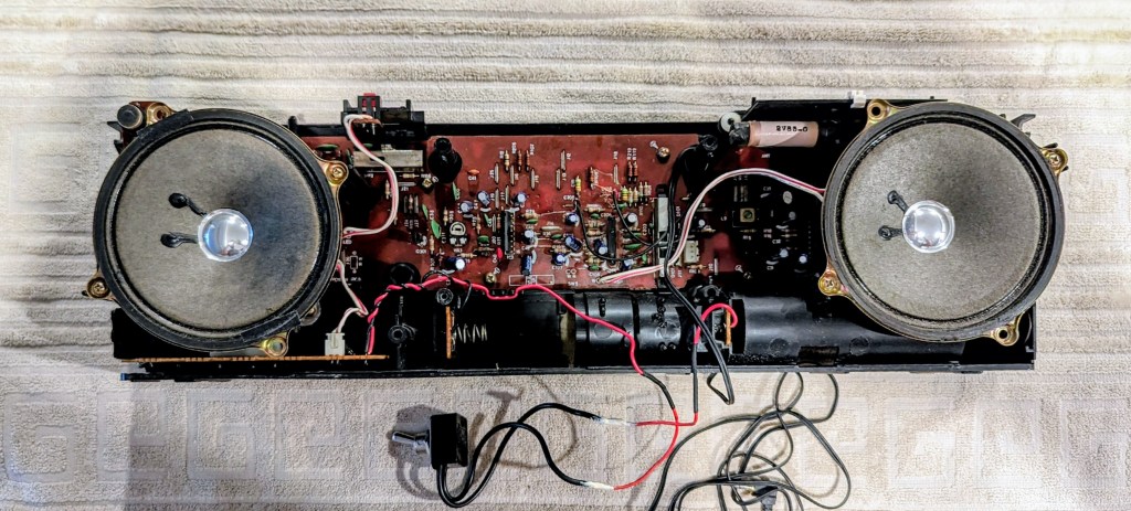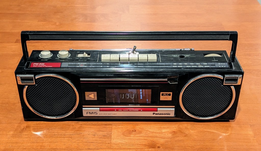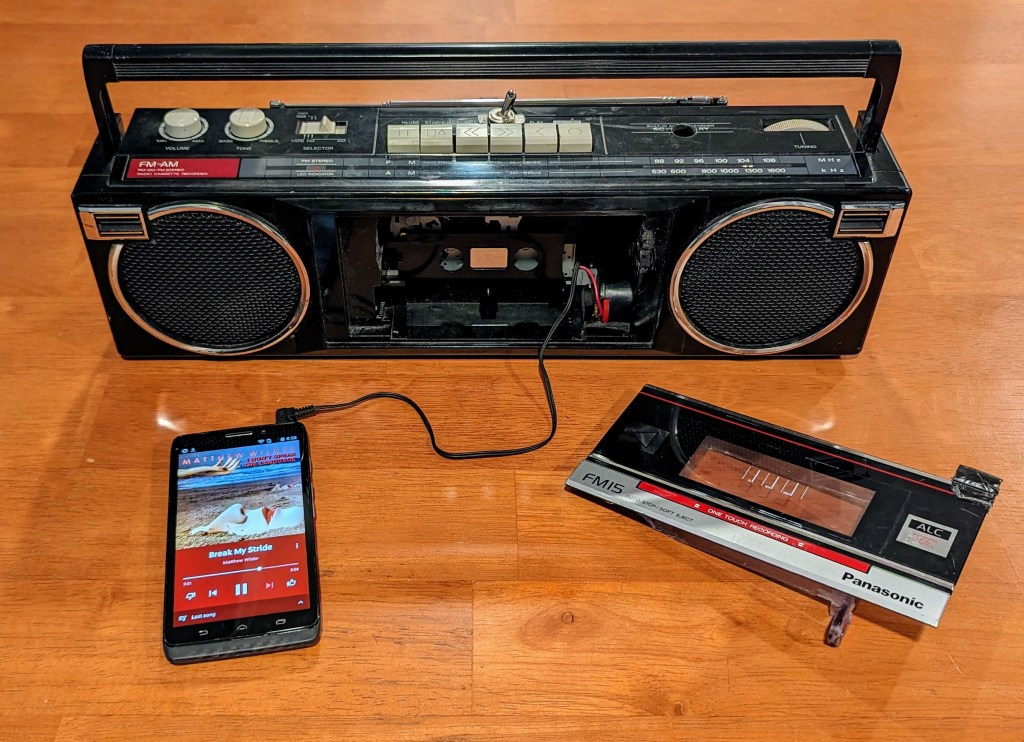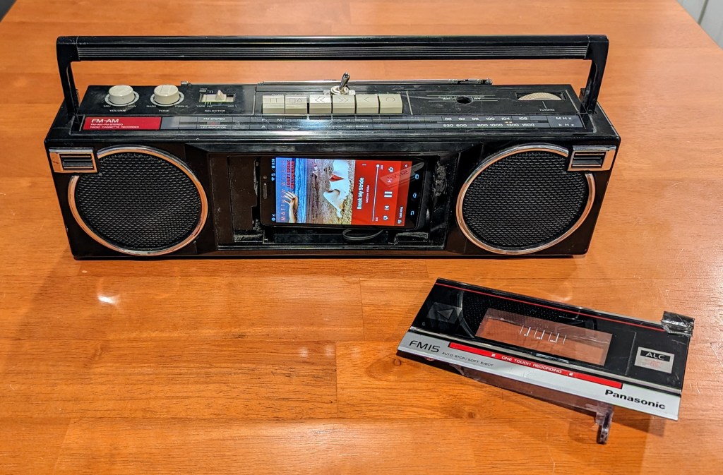 This project adds an AUX port to a 1985 Panasonic RX-FM15 radio by removing the cassette tape deck and utilizing the existing cassette tape amplifier. An Android phone fits in the modified cassette tape area, providing a handpicked playlist of 80’s jams.