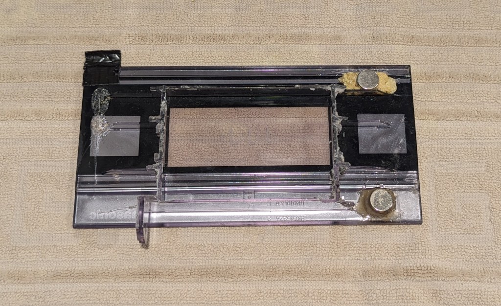 To fit the Android phone in the cassette tape area and still close the original door, much of the plastic door material was removed from the inside, and high strength magnets were glued to the door and inside of the front housing to keep the door shut.