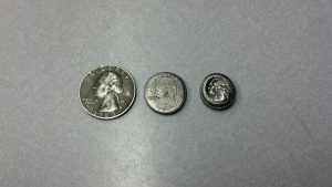 The below image shows US quarters, deformed electromagnetically. Interestingly, all of the minted features are preserved! Though it is fun headline to use the term “shrink”, matter is conserved in this process and the density does not change. Note: the second in from the left (below) does not have the features preserved – this is discussed later.
